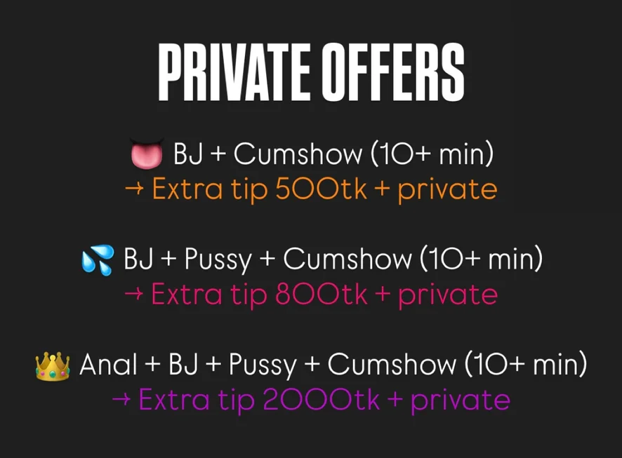 Ahegao, Camel Toe, Deepthroat, Shower, Flashing, Yoga, Cosplay, Flexing, Kissing, Cock Rating, Sex Toys, Twerk, Anal, Facial, Pussy Licking, Massage, Masturbation, Fingering, Blowjob, 69 Position, Cowgirl, Doggy Style, Role Play, Striptease, Topless, Spanking, Erotic Dance